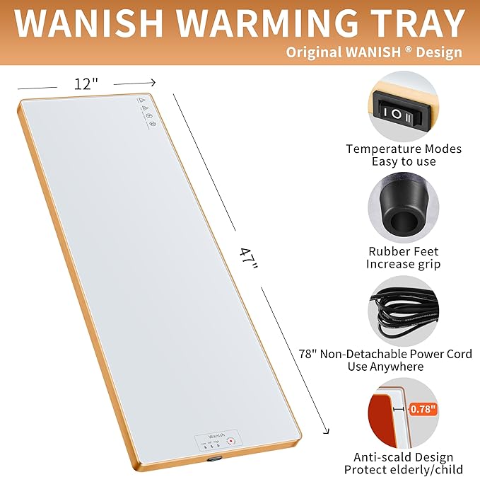 - Unique Warming Tray - Wanish warming trays for buffets party are designed to keep dishes at a consistent, warm temperature, making them ideal for buffets, parties, or family gatherings. Made of heat-resistant tempered glass with gold handles and metal edges, the food warming tray is both elegant and anti-scald. With a large capacity for multiple dishes, easy-to-use push-button temperature control, and a built-in thermostat to keep the food warmer tray safe to use for long periods of time.