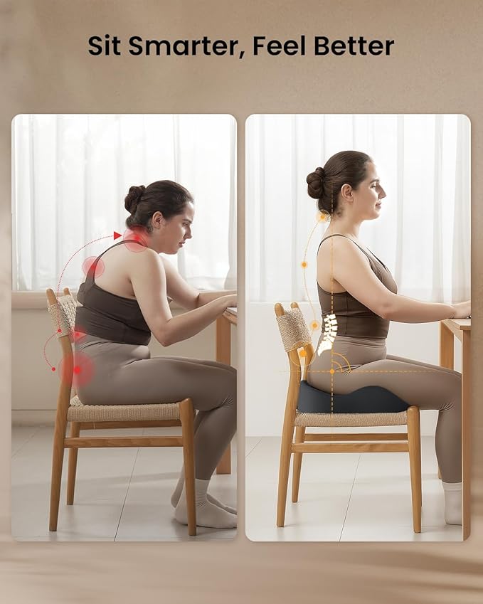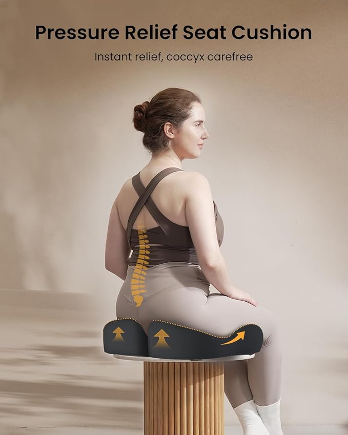 - Targeted Pressure Relief: The split design of our cushion targets pressure points on hips, thighs, and coccyx, alleviating lower back and hip pressure while encouraging proper posture. Experience relief and comfort during extended periods of sitting