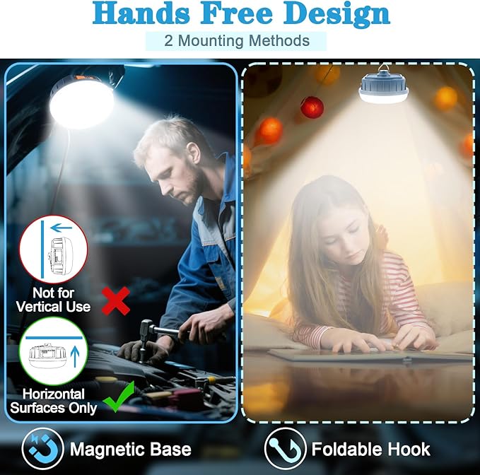 - MAGNETIC BASE DESIGN: The LED camping light has a magnet base that attaches securely to metal surfaces. And the folding hook makes it easy to hang the bright lantern from a tent or tree. Ideal for auto repair, outdoor camping and emergencies.