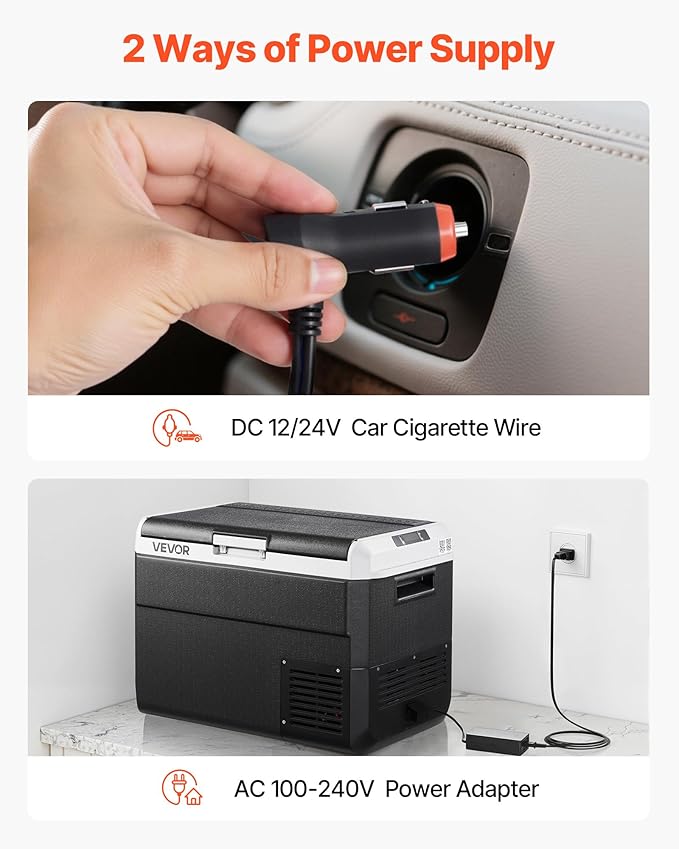 - Dual Use for Home and Car: The portable refrigerator is equipped with an AC 100-240V power cord, DC 12/24V car cigarette wire, and adapter, allowing easy connection to your car/RV’s cigarette lighter port, household outlets, and other power sources