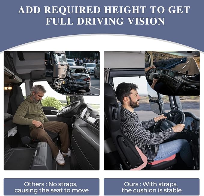 - 👍【Universal Fit with Improved Visibility】Measuring 16.8″ x 18.3″, this cushion fits most car, truck, and office chairs. It raises seating height—especially at the back—to improve lumbar support and optimize driving visibility, enhancing both comfort and safety.