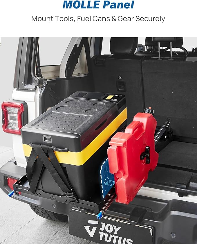 - MORE CONVENIENT DESIGN: Cooler slide pulls and even tilts to 90°, easy for kids to get food/drinks. Built-in fixed strap prevents fridge falling when tracks fully extend. Detachable molle panel adds extra space (for fridge side)