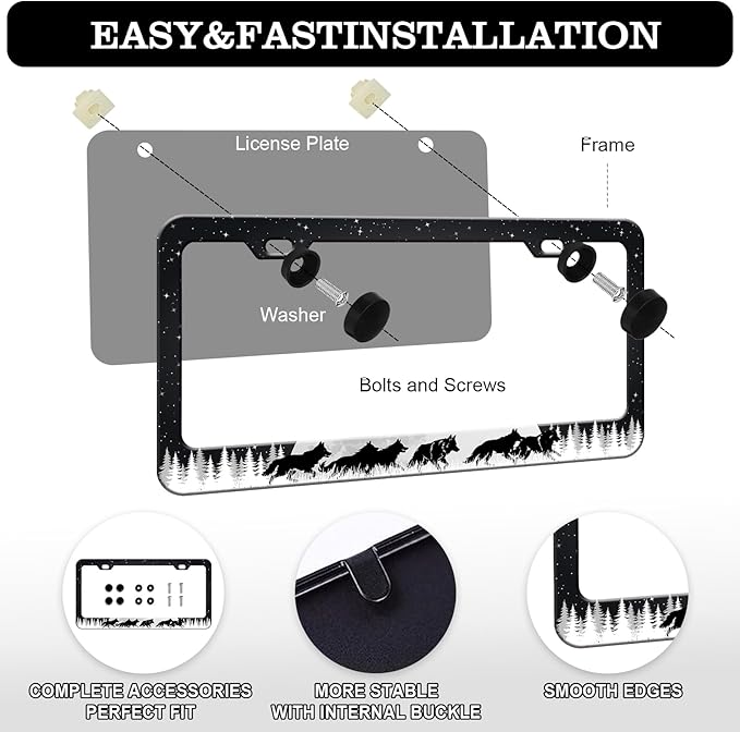 Moon Forest Wolf License Plate Frames - 2 Pack Cool Starry Sky License Plate Holder, Stainless Steel Rust-Proof Waterproof Car Decorative Tag Frame with Screws Fasteners Caps