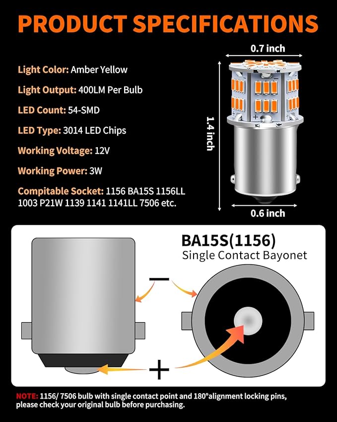 - 【Specification】6PCS AUXLIGHT 1156/ 7506 bulb with 54-SMD high power 3014 LED chips. Working Voltage: 12V, Working Power: 3W, Light Output: 400LM Per Bulb. Super bright amber yellow light color, 360°high luminous efficiency, no blind spots.