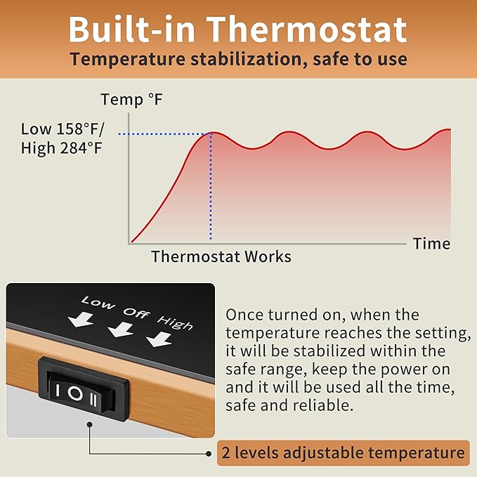 - Safe & Sustainable - 1.With 0.78“ anti-scald edge on the glass surface and aluminum edge, the electric warming mat effectively prevents accidental touching of scalding. 2.With 0.59” raised rubber feet, warming trays for buffets party are non-slip, have better heat dissipation, can be rest assured to placed on marble counters, wooden tables, glass tables and other tabletops for use. 3.The food warmer uses 78" extended power cord, easy to move, no need to worry about the use of space limitations.