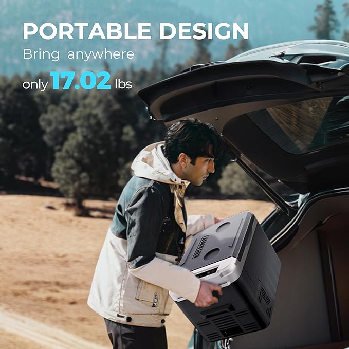 - Portable Degsin& Low Noise: The 12 volt refrigerator weighs only 17 pounds and comes with two handles, you can carry it anywhere. The 12 volt cooler operates with a low-noise cooling system, making only 45 decibels of noise when running, making it a quiet companion on your journey.
