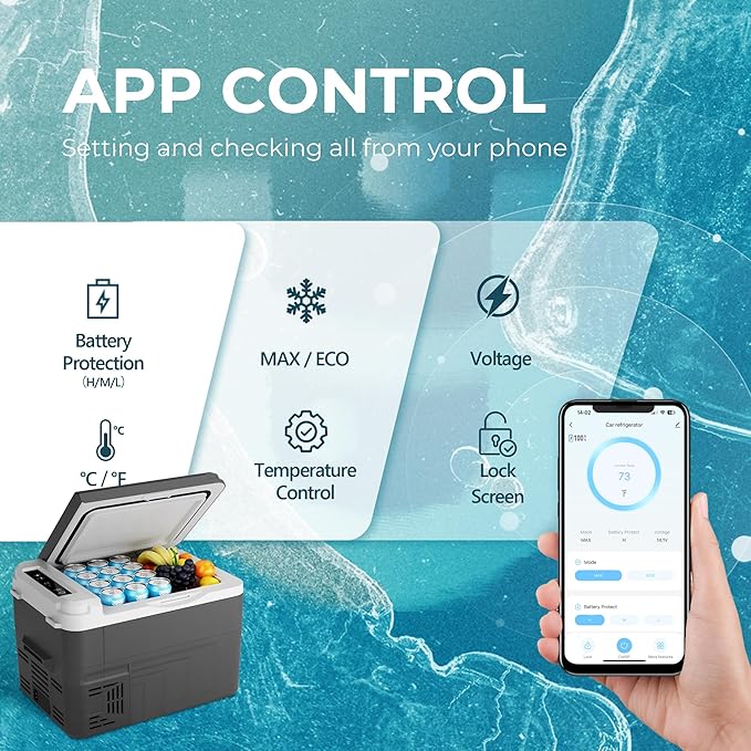 - Powerful Compressor & APP Control:This compact and portable 12V cooler combines convenience and performance with its spacious 11 quart capacity, functioning seamlessly as both a fridge and freezer. Powered by an advanced compressor, it rapidly cools from 68°F to 32°F in just 15 minutes, ensuring your food and drinks stay fresh and chilled. Enhanced with Bluetooth connectivity and app control, this portable freezer allows you to effortlessly monitor and adjust settings remotely.