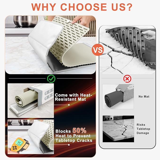 - Why Choose Us? Concerned about tabletop cracking? Our FYY Food Warming Mat included super heat-resistant mat blocks up to 50% of heat, safeguarding heat-sensitive granite, marble or wood surfaces from cracks and damage. (Note: When using this product on heat-sensitive countertops, always place a heat-insulating pad underneath to prevent the countertop from cracking due to excessive heat.)