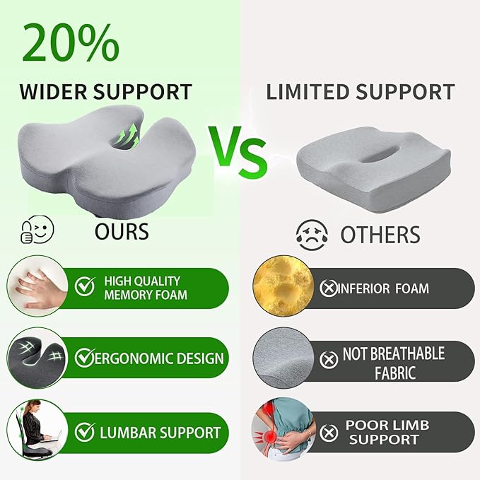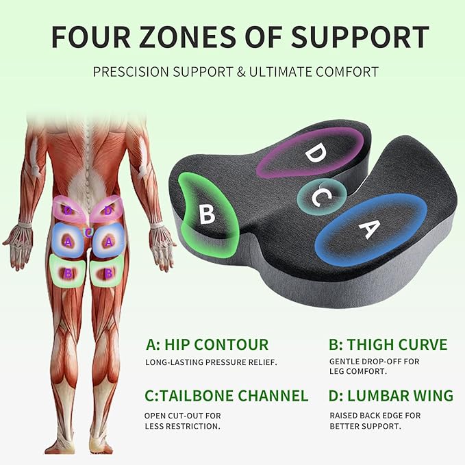- 【Ergonomic Memory Foam Design】: Experience superior posture support with our specially engineered one-piece cushion. Our ergonomic design, it contours to your body's natural curves, targeting pressure points on hips and tailbone. Perfect as an office chair cushion or desk chair cushion, it promotes spinal alignment and helps improve sitting comfort during long work hours—ideal for home offices or corporate settings.This seat cushion molds to your body’s natural curves to cradle your coccyx and relieve hip pressure for all‑day comfort.