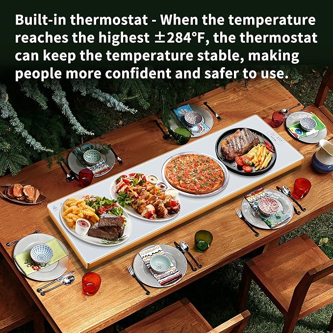 - Quick Keep Warm - Food warming trays for buffet just need to power on, turn on the high-temp 284℉/low-temp 158℉, preheat it for a while, put the cooked hot dishes on food warmers to get the best warming effect. The warmers for food trays buffet use heating wire + heating film with PTC heating technology, can make the whole glass surface heated and keep the dish warm evenly. 2 modes of temperature adjustable mechanical button operation, avoid unnecessary trouble operation, convenient and fast.
