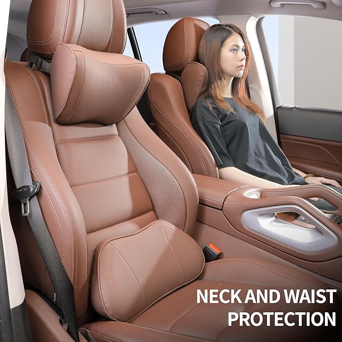 Lumbar Support Pillow for Car, Premium Leather Memory Foam Lumbar Cushion for Lower Back Pain Relief, Universal Back Support for Driving, Home & Office Chairs, Brown, 1 Pack