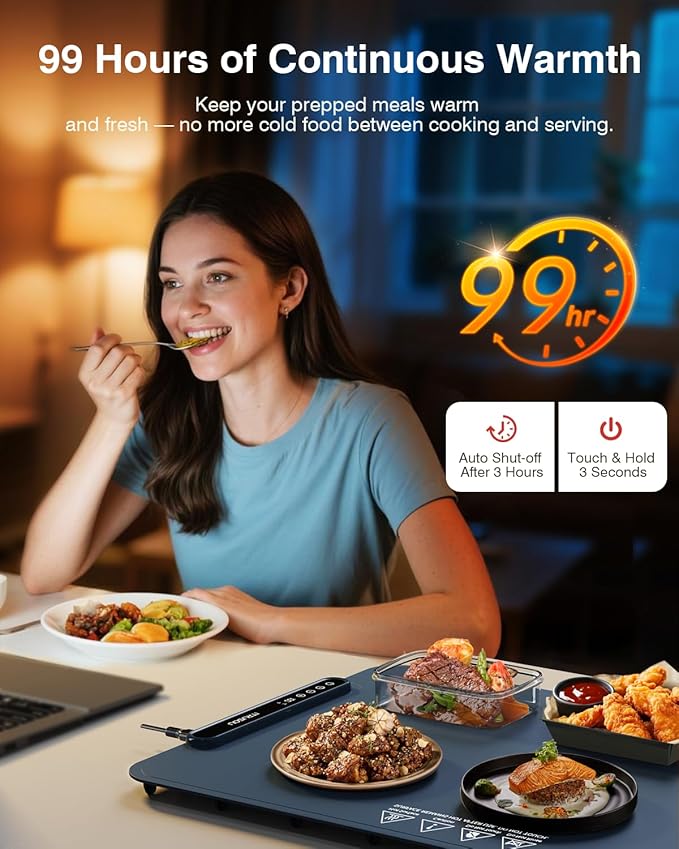 - 1-99 HOURS Keep Warm: From quick family dinners to multi-day celebrations, this adjustable heating timer has you covered. iTRUSOU electric warming tray offers 1–8 hour presets and hold the timer key for 3 seconds to enable 99 hours of steady heat—whether it's a quick dinner or a three-day family reunion.