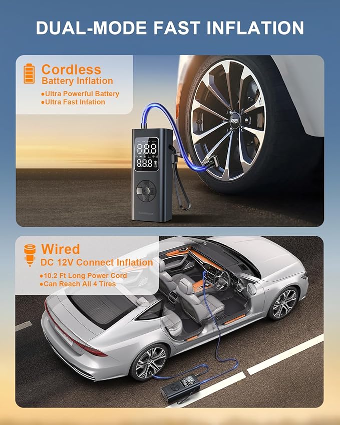 - [Dual -Mode Fast Inflation ] Cordless & Wired connection for inflation. Ensure your journey can inflate quickly anytime, Anywher. Whether it's on the road or in the wild. Portable car tire inflator cigarette lighter supports 12V DC car power input .Match a 10ft DC charging cable. So you can switch to vehicle power when needed. Works even with no batterypower. Easily Respond to the Emergency Situation of a flat tire. Suitable for every journey. In a fully charged state, Fills up to 20X car tires (28-36 PSI), 113X motorcycle tires(28-33PSI), 19X bicycle tires(0-150PSI), and up to 120 basketballs(0-8PSI).
