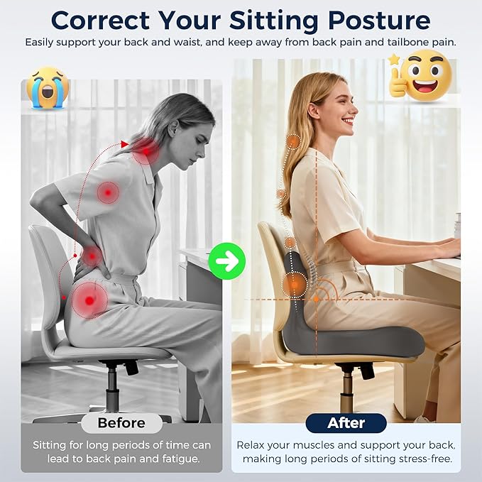 - 【Ergonomic One-Piece Design】:This L-shaped seat cushion is an integrated chair cushion that perfectly fits the natural curve of your spine, providing firm lumbar and hip support. Our office chair cushion helps relieve tailbone and lower back pressure, encourages a healthy S-shaped posture, and reduces discomfort from long sitting sessions.