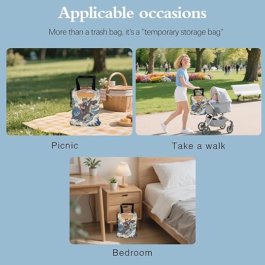 - Capacity and Prints: Despite its compact size, the trash bag offers ample space for just the right amount of trash without taking up too much space inside your vehicle. The stylish design and various patterns add a touch of personality to your vehicle's interior