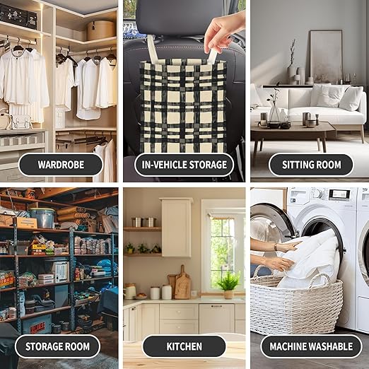 Cute Car Trash Can, Hanging Canvas Car Back Seat Organizer and Storage Bag, Funny Car Trash Bag for Travelling, Outdoor Cute Beige Black Plaid