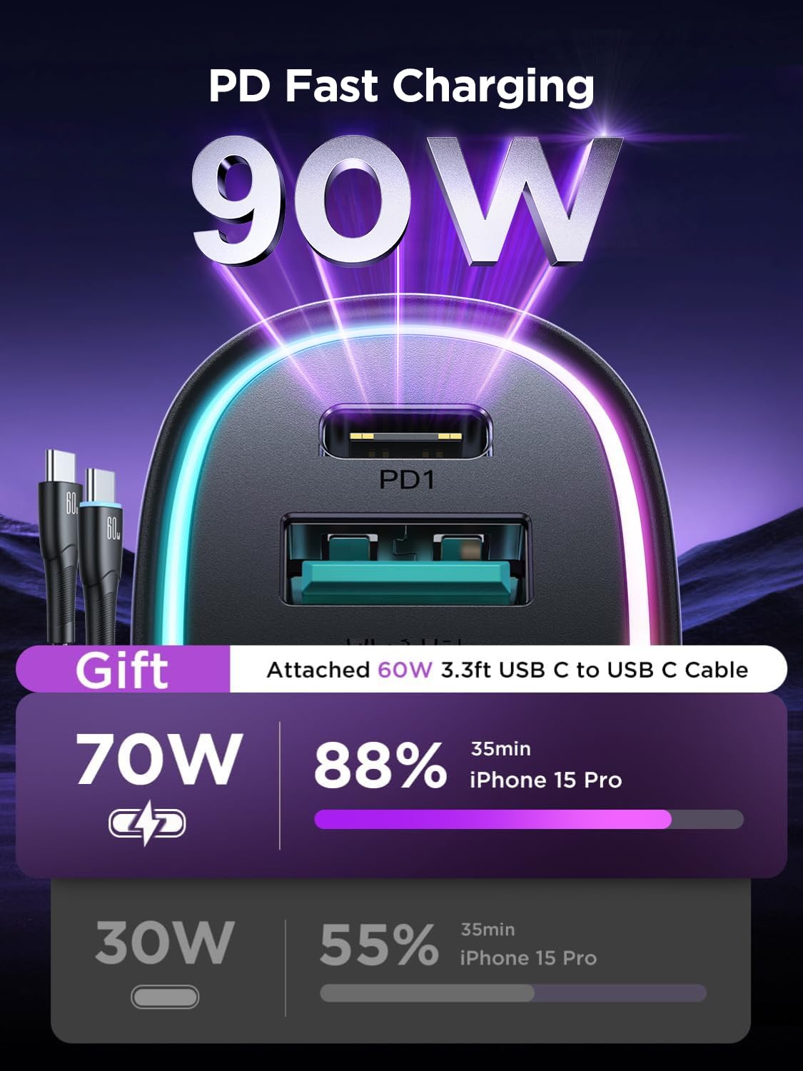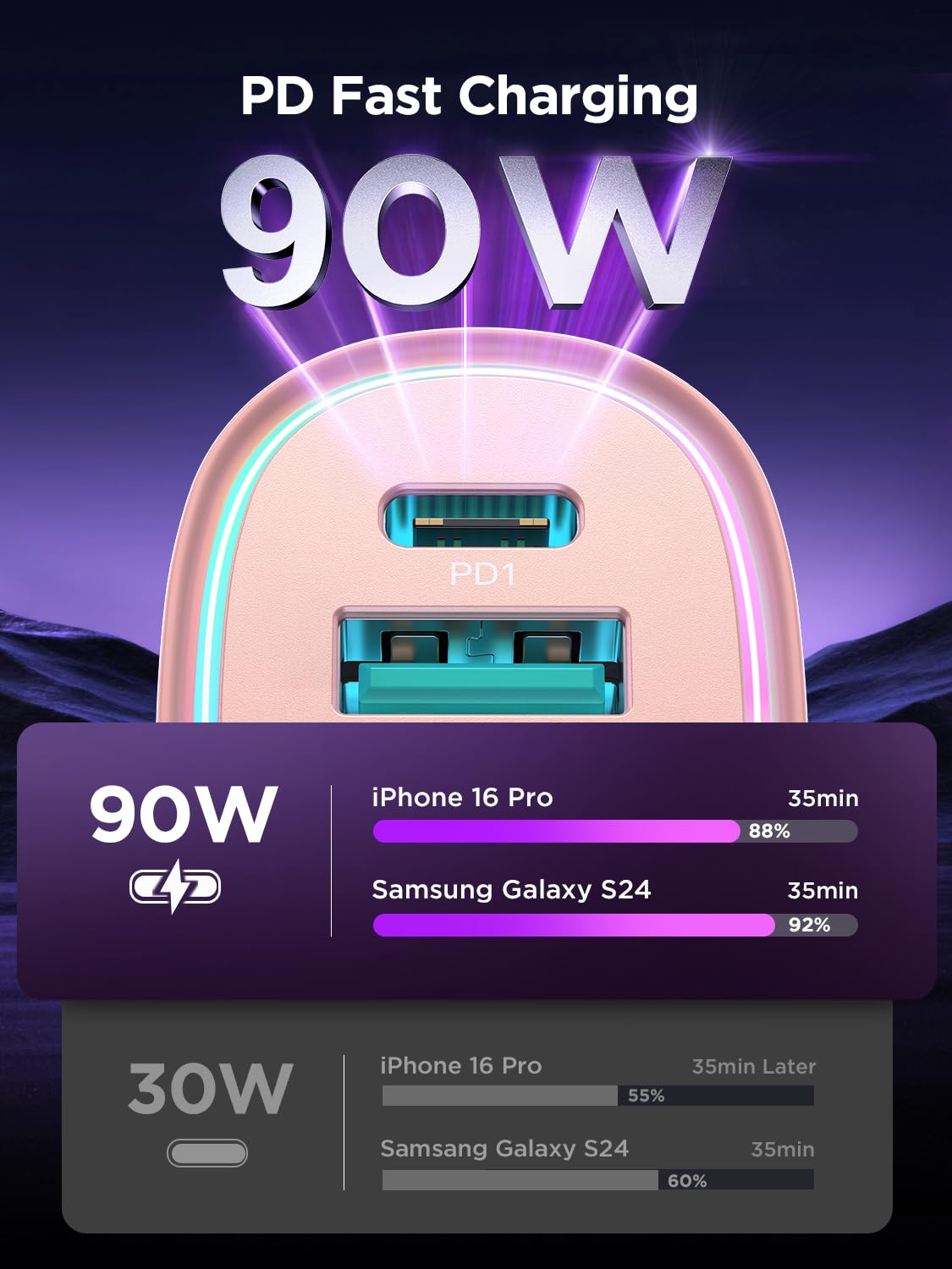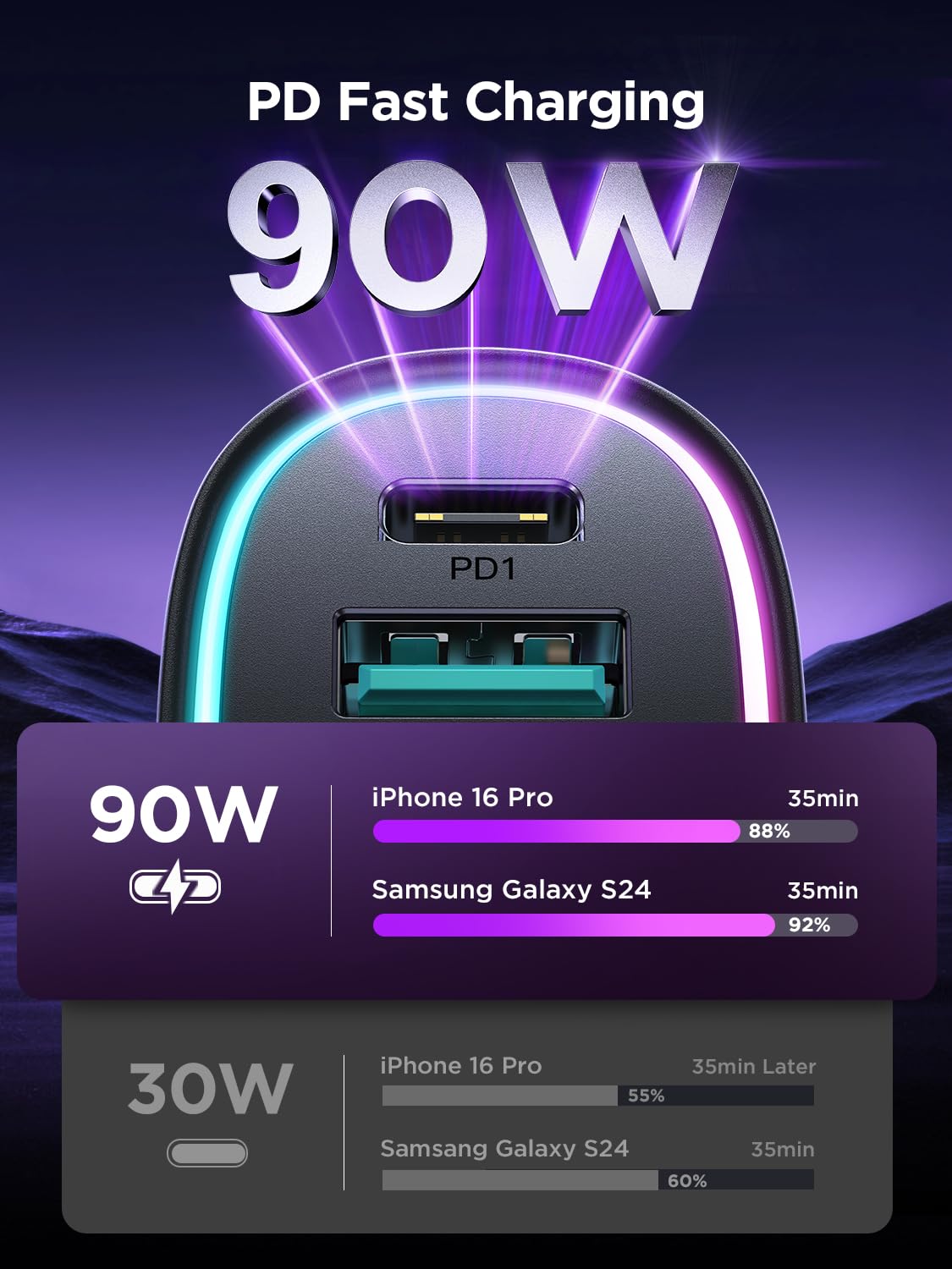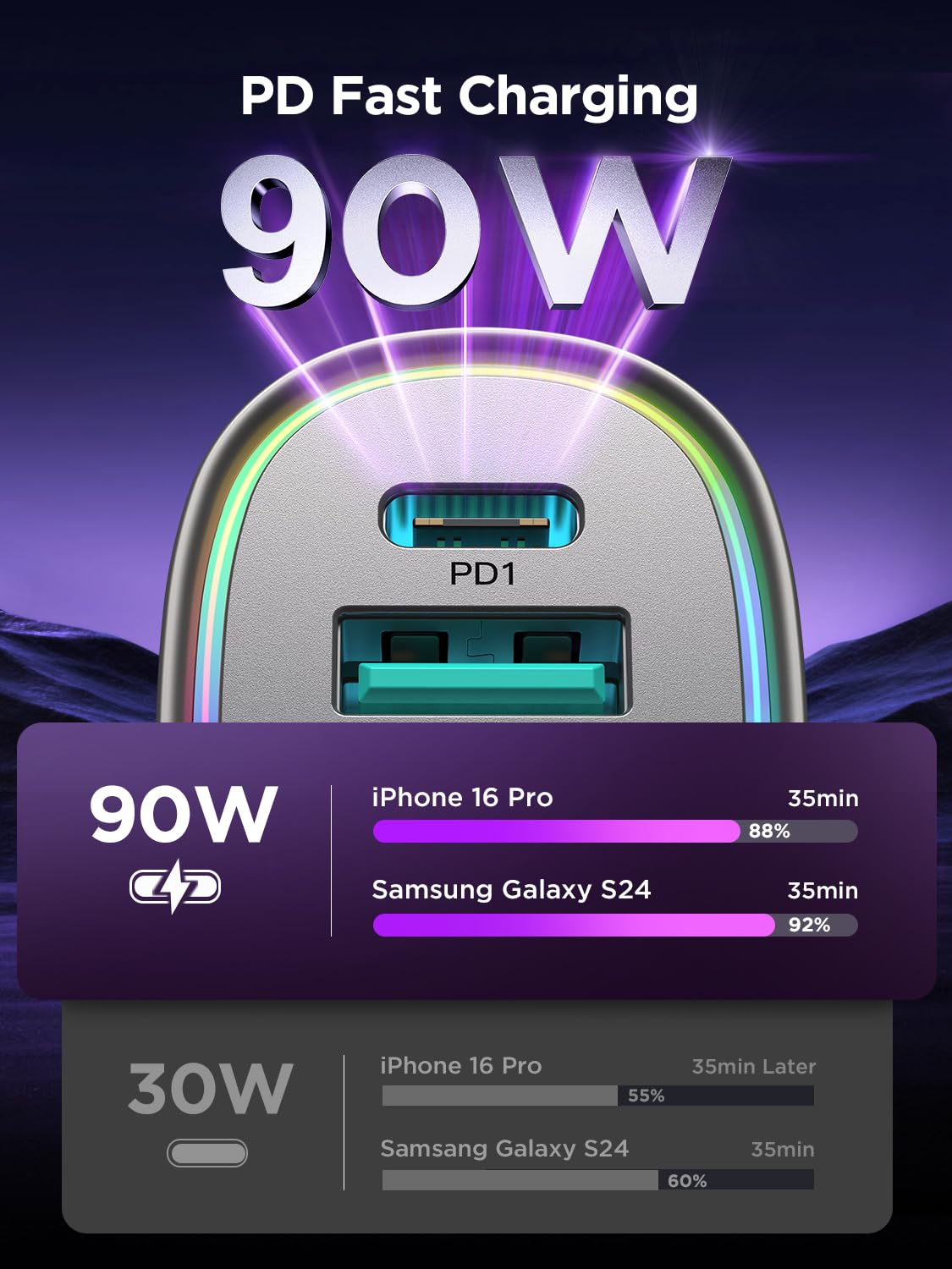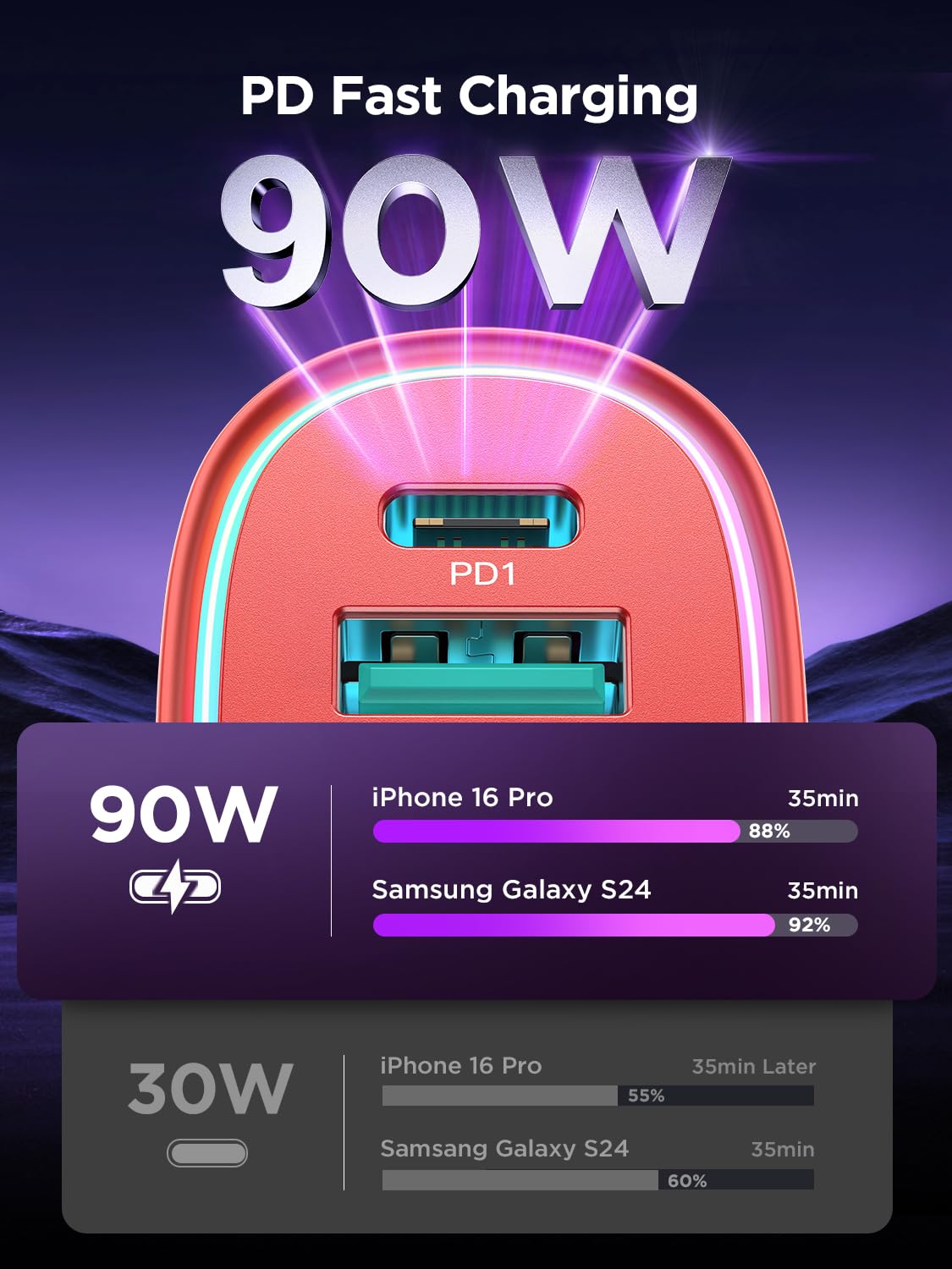 - [45W USB C &18W USB A] Car phone charger PD 3.0 port output 45W(max), 5X faster than 2.1A charger, charges iPhone 16 Pro from 0-50% in just 20 minutes. QC 3.0 port output 18W, charges most Android devices from 0% to 60% within 35 minutes