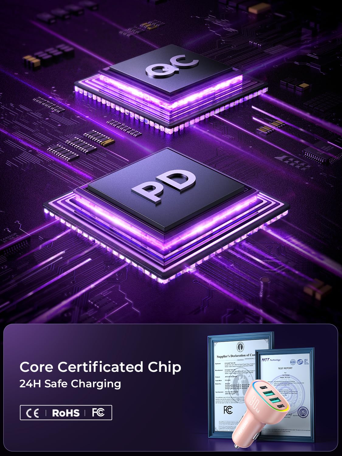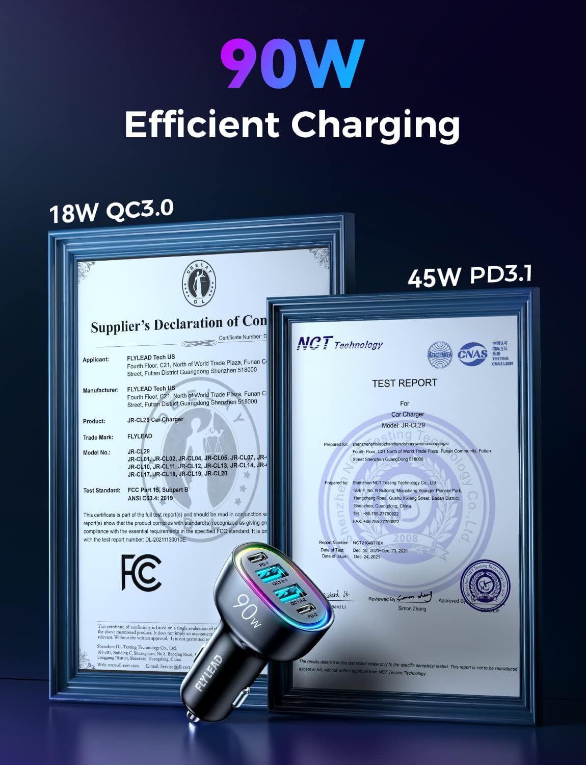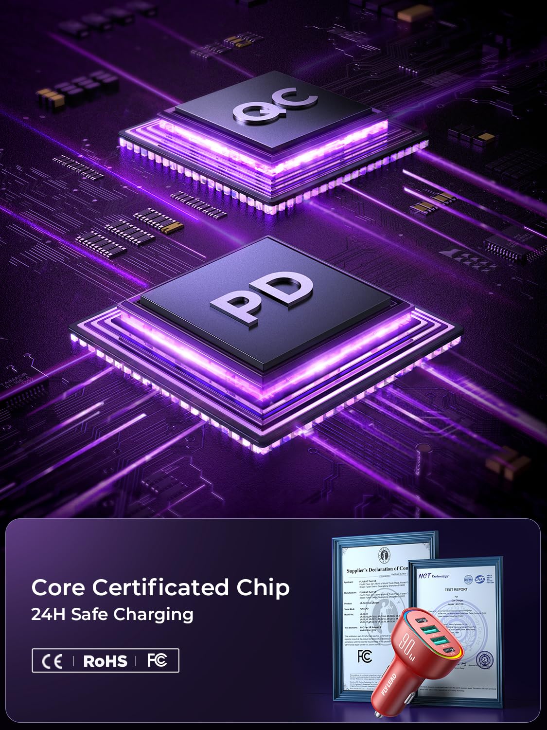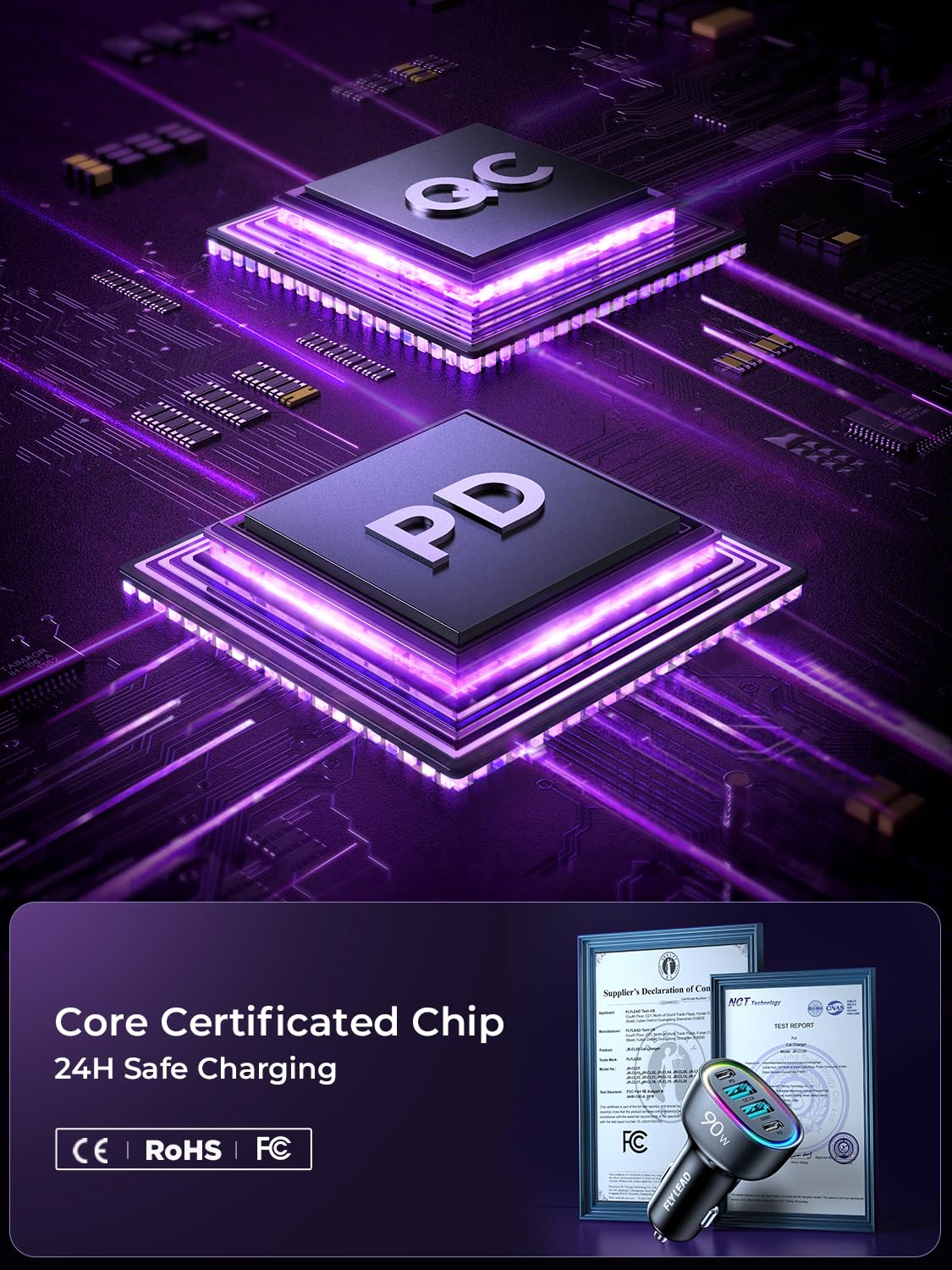 - [UL and FCC Certification] FLYLEAD car USB C cigarette lighter fast charger has provided the advanced intelligent circuity safety system to prevent short-circuit, overheating, overcurrent, and overcharging. USB C car charger can automatically identifies any devices you plug in and distributes the optimal charging efficiency for you